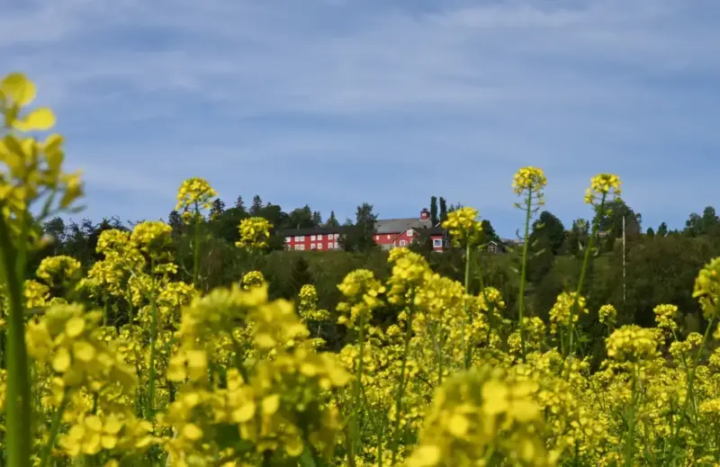 På gården foredler vi kjøtt fra lam og frilandsgris, og vi dyrker blant annet korn, karve, raps og sennep. Alt foregår på gården – fra råvare til ferdig produkt.